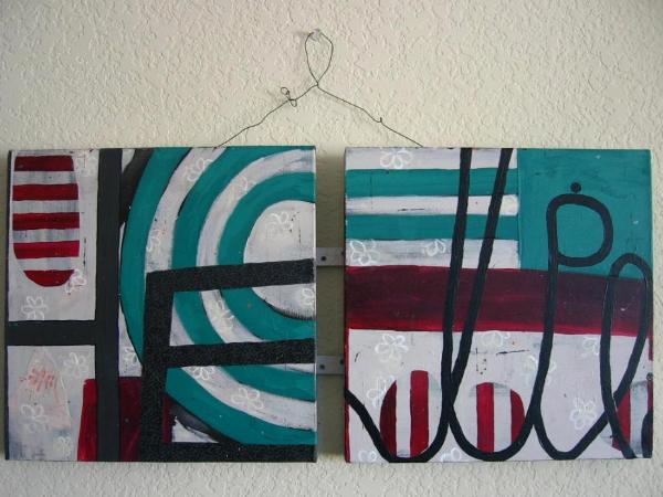 'Small and Untitled' with exposed wire hanger (Gaza series) 2 12" X 12" X 1.5" connected with metal brackets - Acrylic and mixed media on canvas (exposed wire hanger)