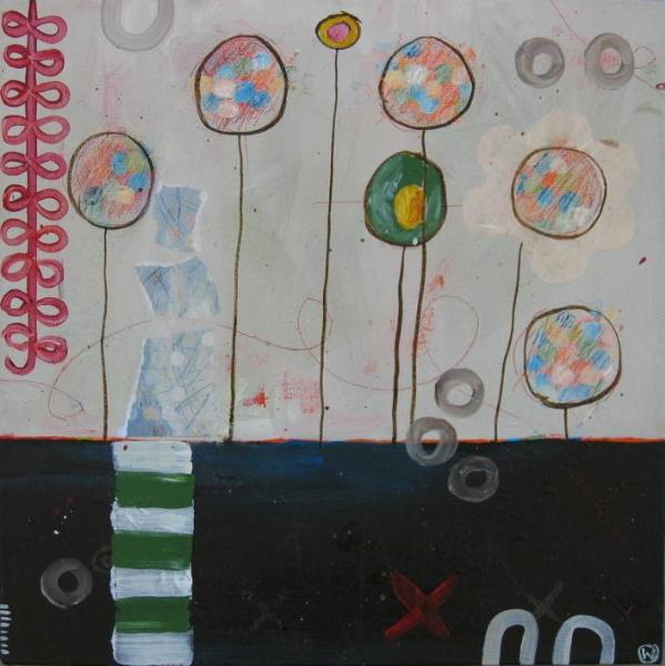 Acrylic and mixed media on canvas. 12" X 12" X 1.5" (sides painted, no need for frame - wire hanger included)