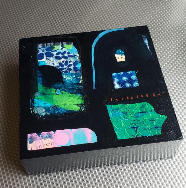 Mixed media on cradled birch panel. 6"x6"x1.5" (sides painted, sawtooth hanger on back)