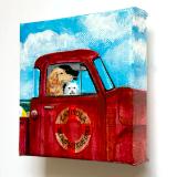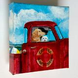 In this Black Lab’s dream he and his best pals are driving on the beach in the surf club’s Chevy truck, for a day of fun in the sun, splashing in the cool water, and maybe rescuing a few tennis balls from the surf.