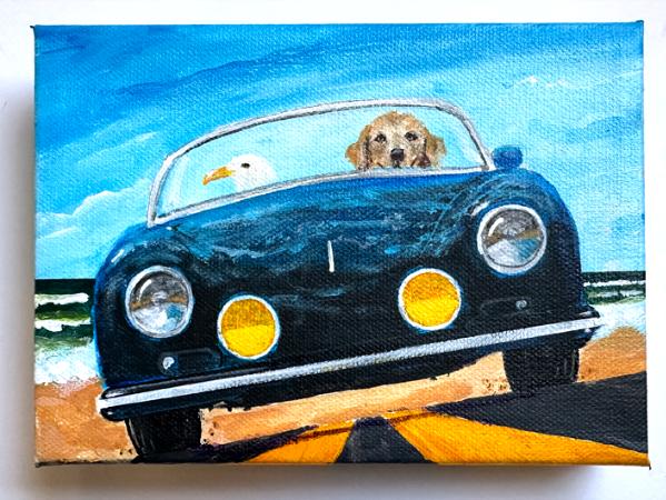 Captured in Genuine Doggy-Vision© with fine French acrylics over a 5 by 7 inch gallery wrap canvas by local artguy Vern Scharf, and coated with several coats of protective varnish making this dream day highly portable and pretty lick-resistant.