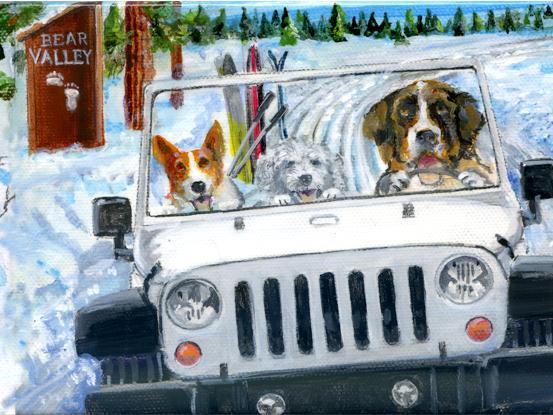 PIPPA, MONTE AND PAX HIT THE SLOPES Dog dreams have mystified the populace since the pet dogs were invented. What do dogs dream about while they are snoozing all over your best stuff? No one can be sure, but in Pax’s dream, they have somehow worked the key into the family Jeep, started it and are tearing around the mountains with no collars, no tags, no adult supervision, and driving with only an expired dog license. Could life be better?