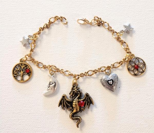 This dragon bracelet comes with a tree of life charm, moon charm, and a mini locket . Mixed gold and silver toned charms on a 7.5" chain.