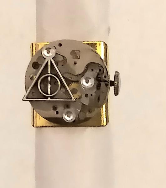 Geometric ring, with the repurposed inner workings of an old watch. Base is a bright gold tone.