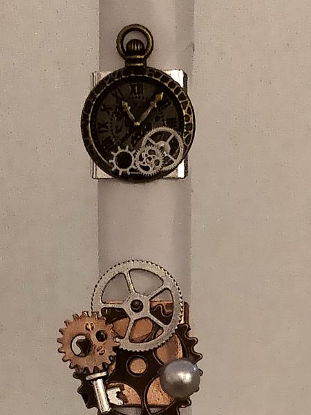 Steampunk Rings. The first is a watch with gears in antique brass and bright silver tones. The second ring features gears and a key in bright silver and copper tones. Each is $25.