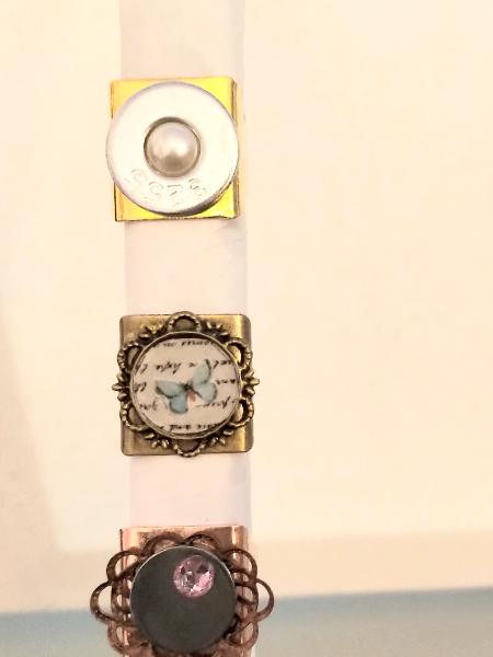 | Trio of rings, Each $20CA$20 Trio of rings. Each is $20 The first one is silver on bright gold with a faux pearl accent The second is a small medallion I made sitting on an antique brass base The third has a silver tone disk with a pink stone accent and copper filagree frame on a bright copper base.